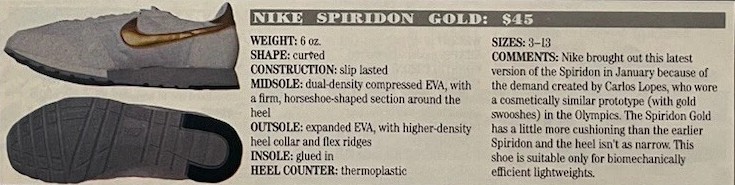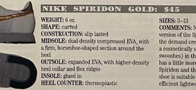 The Spiridon Gold was straightforward in its technology. It featured a nylon upper, a dual-density EVA foam midsole called Phylon for added stability, and the heel cup system Nike referred to as the Cobra Collar. The shoe weighed in at only 159 grams.