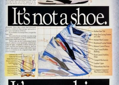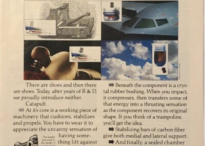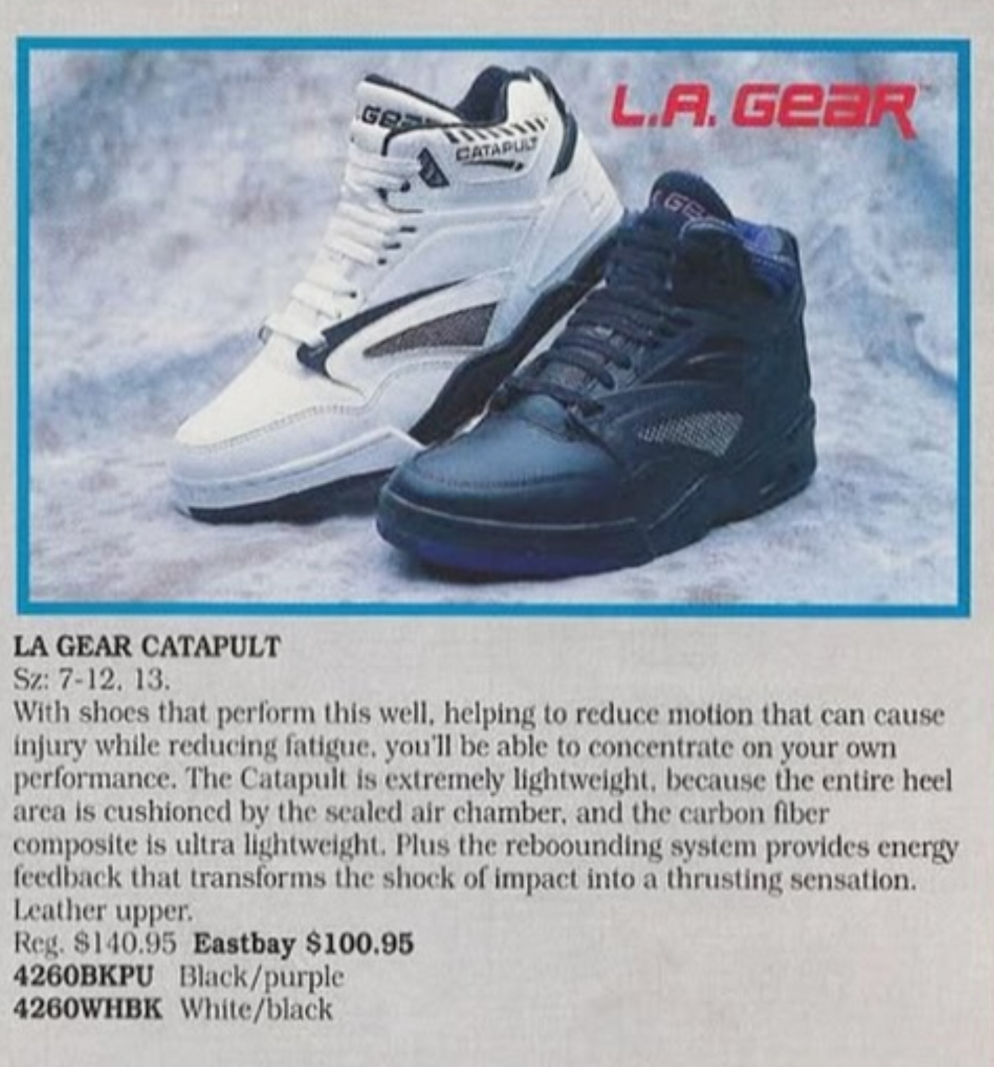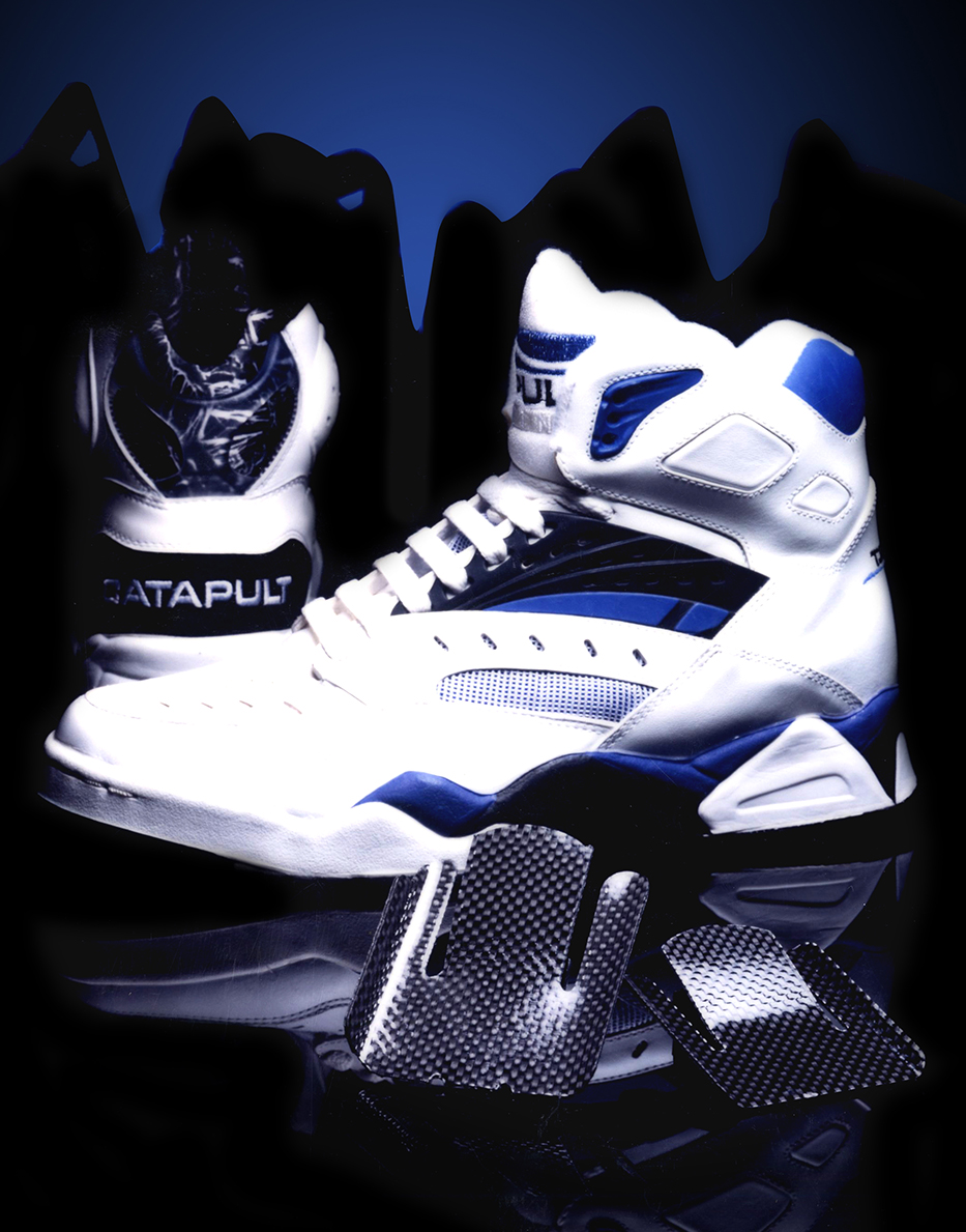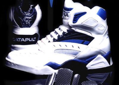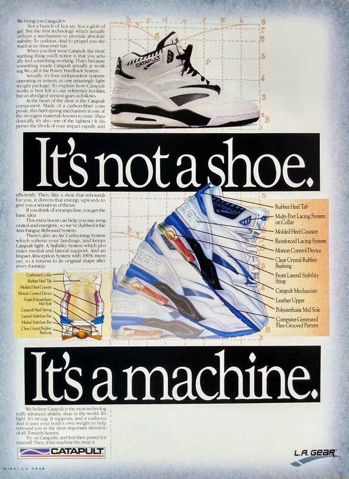 This lead to the Catapult, using what was dubbed the Power Feedback System. At the centre of this was a carbon-fibre lever under the heel which was shaped to bend under impact and then spring back into shape. It promised the ability to jump higher compared to its competitors. Unfortunately the technology did not survive long, L.A. Gear getting involved in legal disputes with Nike over patent infringement.