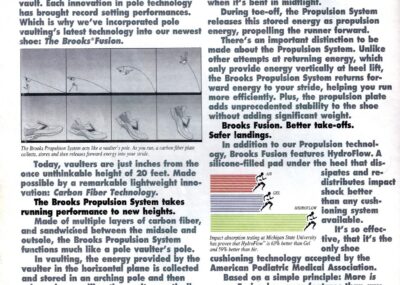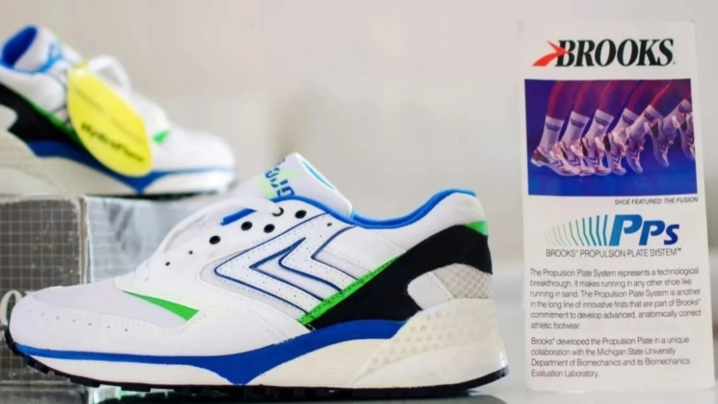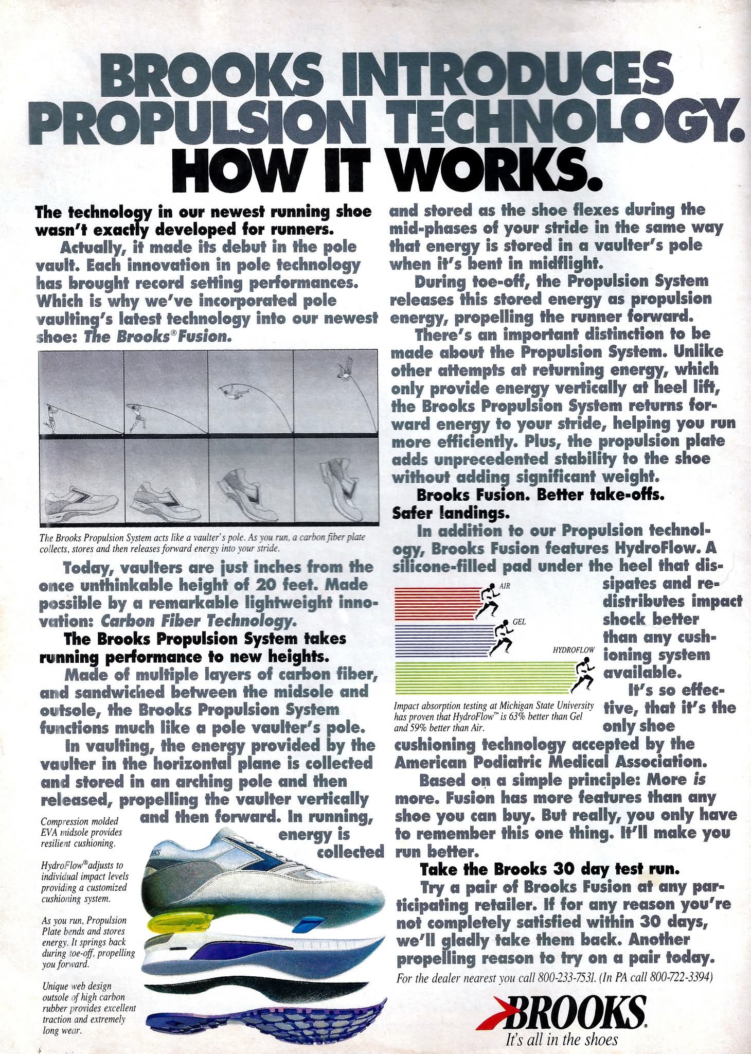 Advertising by Brooks was explicit as to the benefits of the Propulsion Plate System, describing how it helped propel runners through their gait cycle as the carbon-fibre plate flexed and rebounded just like modern running shoes with the same technology.