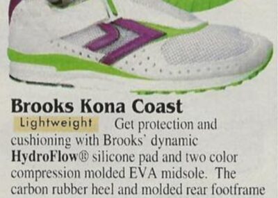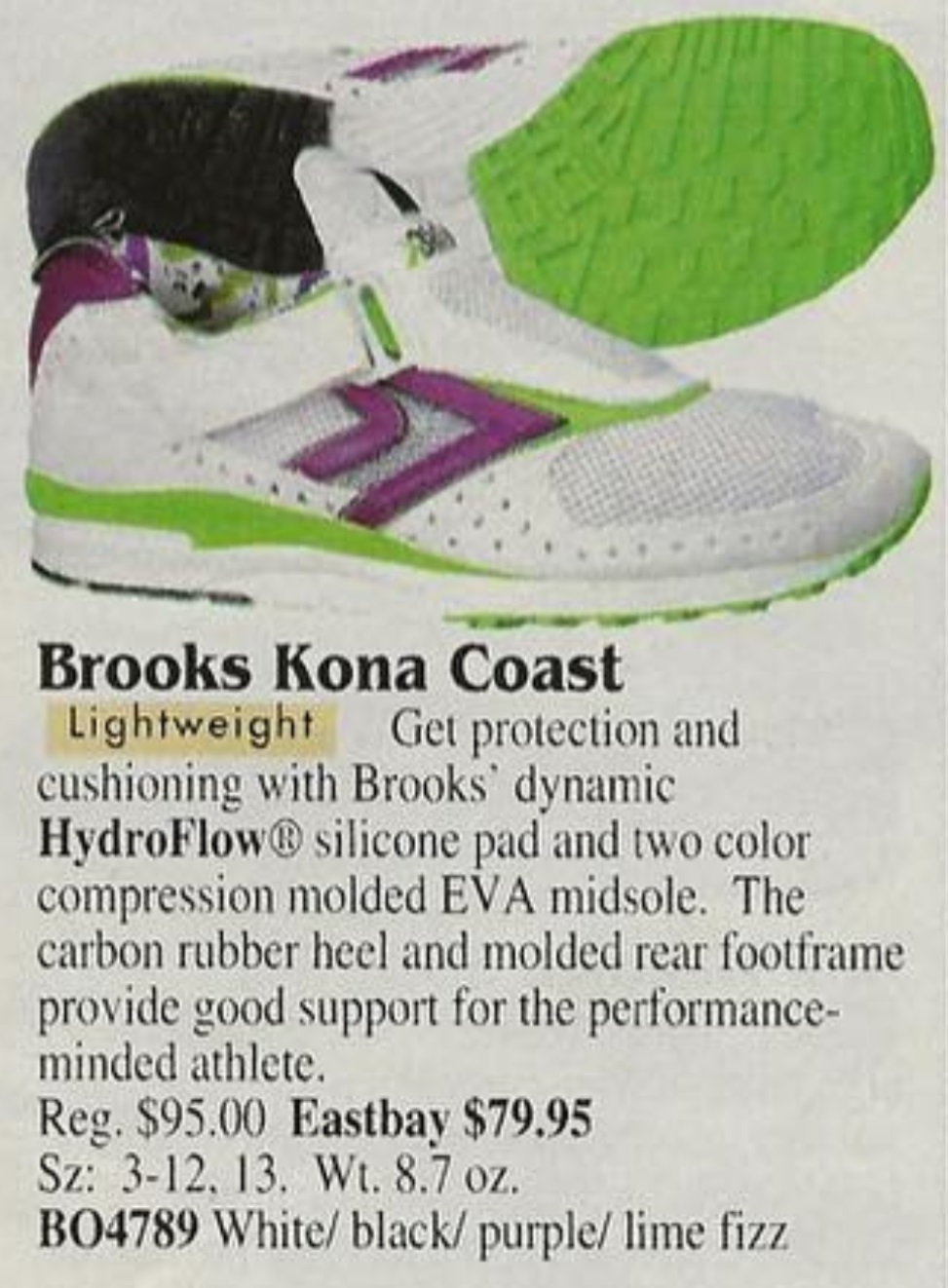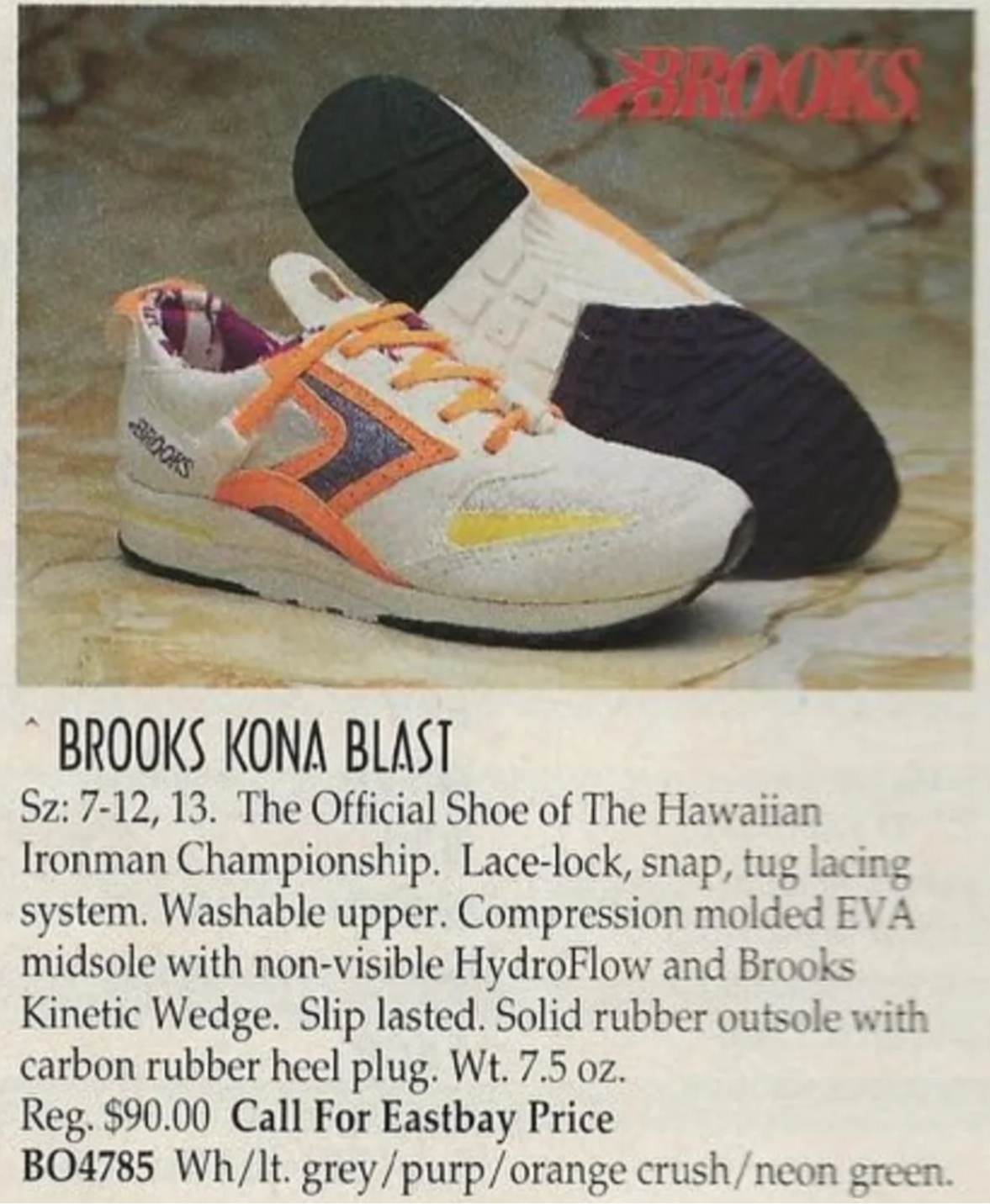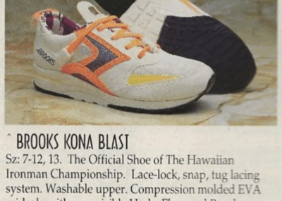 Will Albers was one of Brooks lead designers at the time, and in my correspondence with him confirmed that there was unfortunately never any real interest or motivation to take the Propulsion Plate System racing. Albers designed the Conquest, which was a traditional and effective racing flat weighing in at 170 grams, as well as the 210 gram Kona Blast that first launched in 1990 and included an upper more suited for triathlon racing (allowing the shoe to be put on quicker during these extremely gruelling competitions) as well as HydroFlow cushioning (more on that later).
