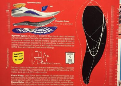Introduced back in 1989 in several models including the GFS 100 pictured here, HydroFlow used silicone fluid in two connected chambers that forced the material forwards during the gait cycle. Testing suggested this was much more effective at absorbing impacts than the gel technology employed by ASICS as well as Nike Air. As we know more today, effective cushioning is the key to making carbon-fibre plate running shoes work most effectively.