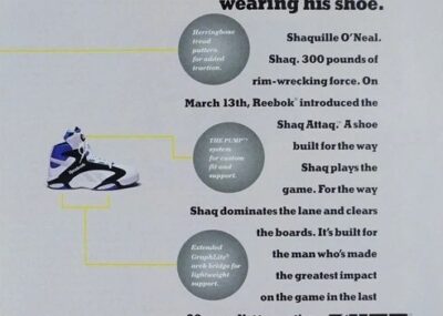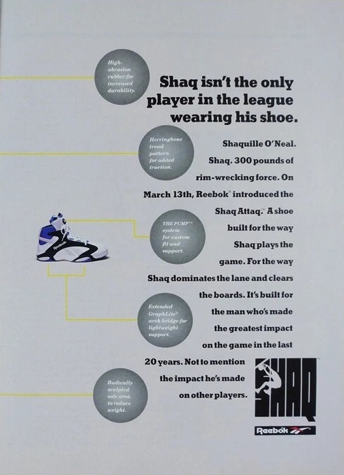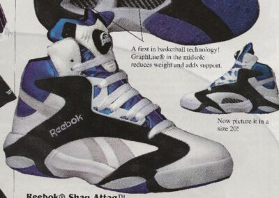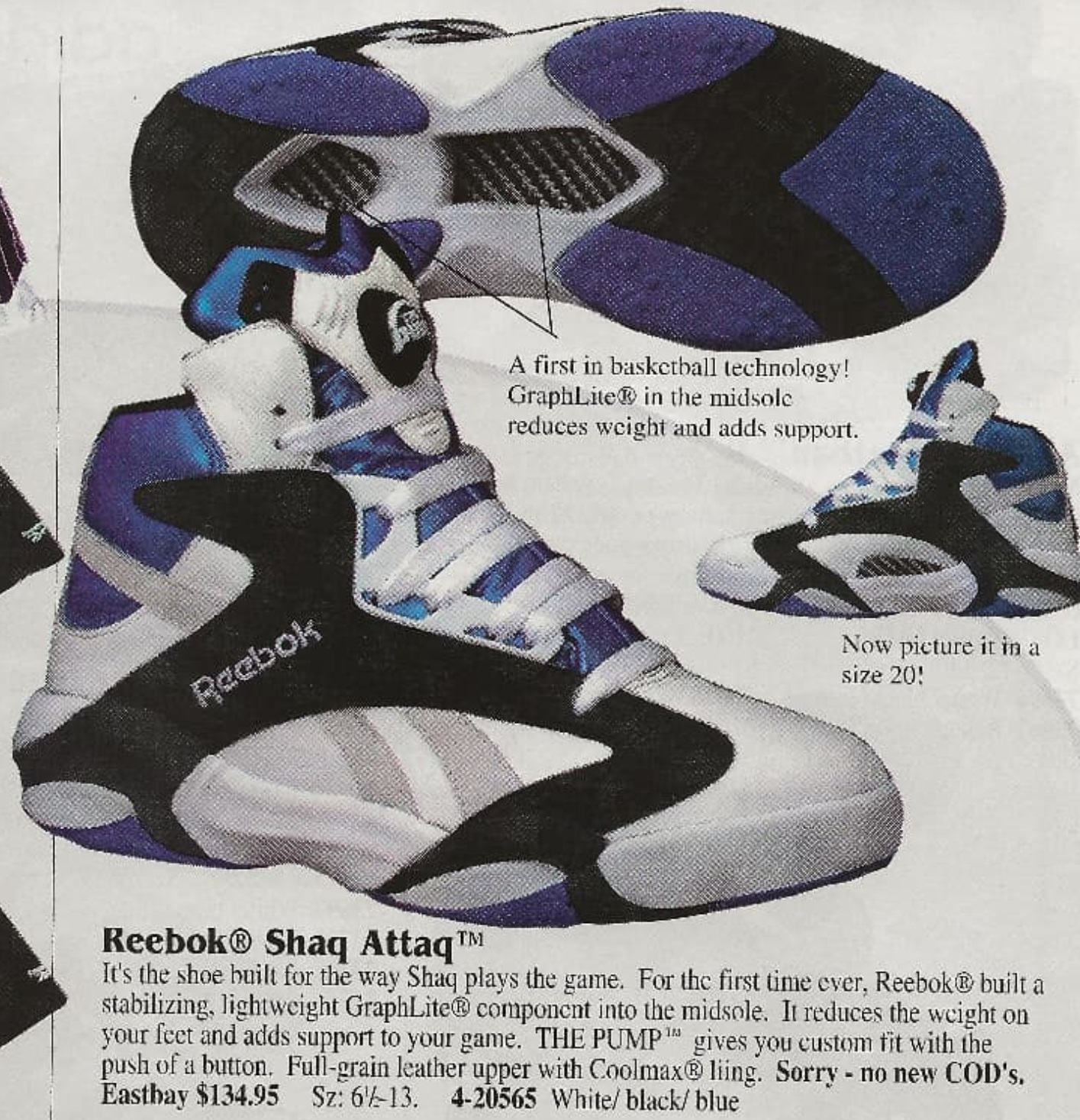 1992 would also see the launch of the Reebok Shaq Attaq, designed specifically for the needs of rookie and future basketball legend Shaquille O’Neal. It had within the midsole a graphlite plate that extended from the heel until just before the toes would flex. It was designed to provide stability for the 7-foot-1-inch center.