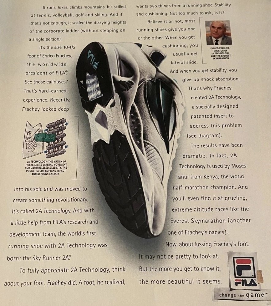 To explain further, 2A cushioning used ambient air with small plastic pillars to absorb shock and improve stability. This is somewhat different to Zoom Air as used by Nike, which contains an inert gas, although both technologies improved rebound as well. It also means that the Fila Tanui had arguably the same ingredients as the Nike Air Zoom Alphafly series, just in a far more accessible formulation.