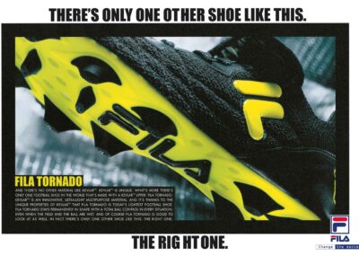 Following from this were the Tornado II and Fascino II in 1999, both still using Kevlar material for their uppers but deviating in design with the Tornado II using leather to reinforce the sides of the boot around the midfoot. There was also the Ragnatela, or spider in Italian, which combined the fabric with a distinctive neon green web design. My understanding is that the model was released in 2000, and was the last hurrah for the technology before Fila focussed on more traditional products. It is not clear whether this decision was influenced by the management issues eluded to earlier that plagued the company during this time.