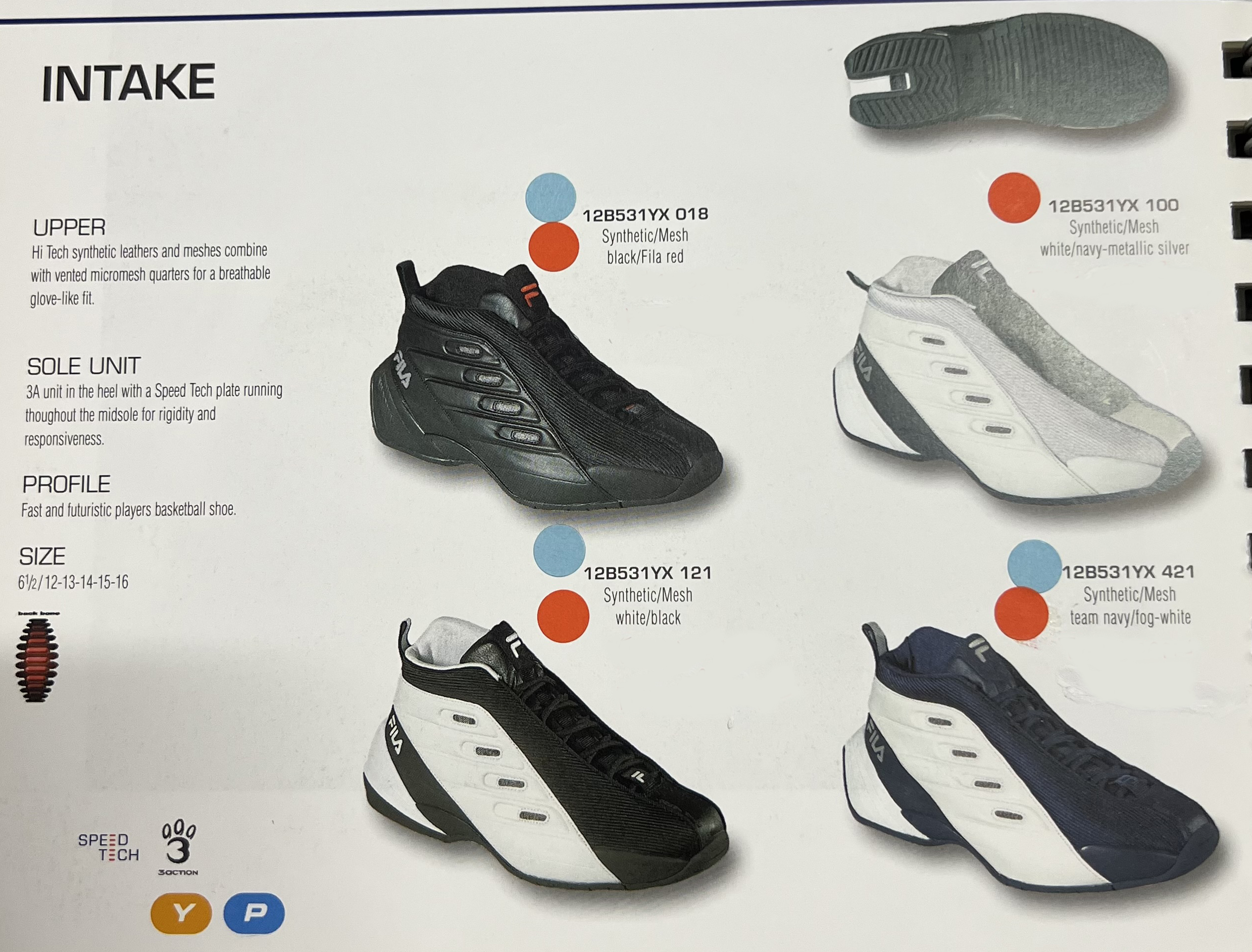 This was highly unusual given the use of carbon-fibre in basketball shoes was generally more along the lines of the Sieze and Rossa to provide further stability, with some notable exceptions such as the Air Jordan XI. It would appear the plate setup in the Fila Intake managed to avoid rules set by the National Basketball Association that ban shoes giving an undue competitive advantage. L.A. Gear, Reebok, and Nike similarly avoided bans for their use of plates, carbon-fibre or otherwise.