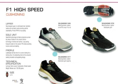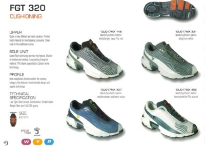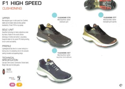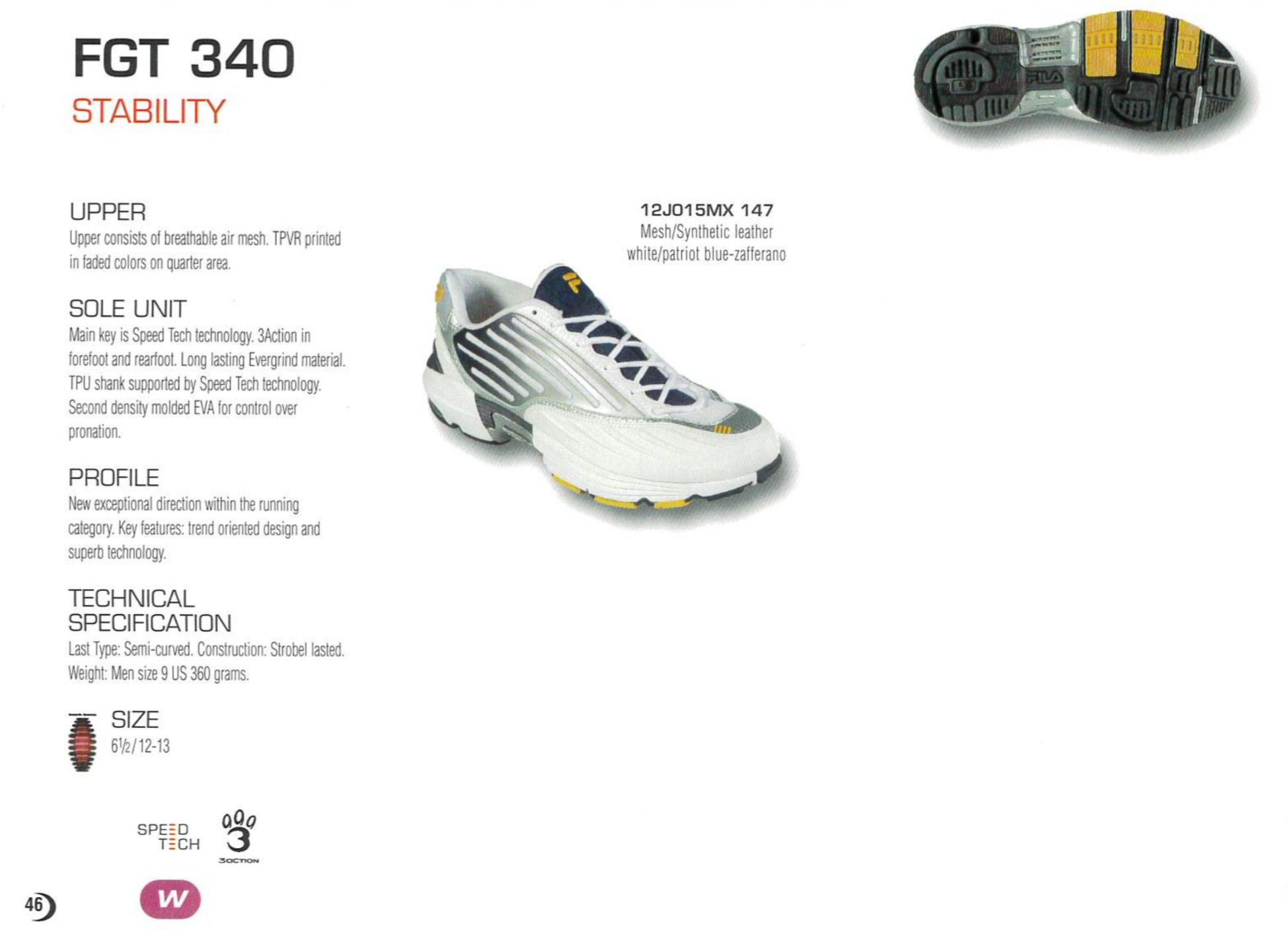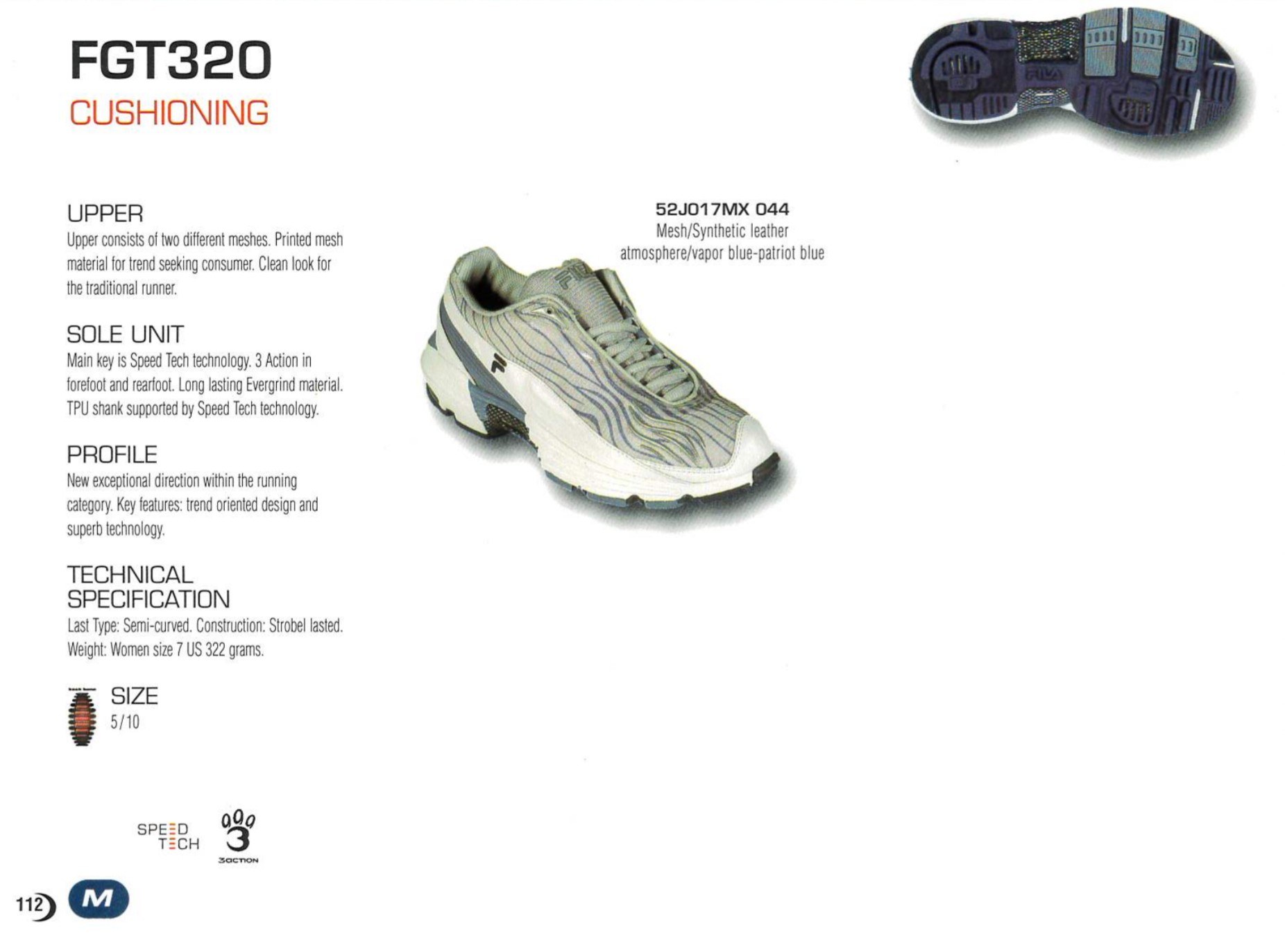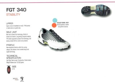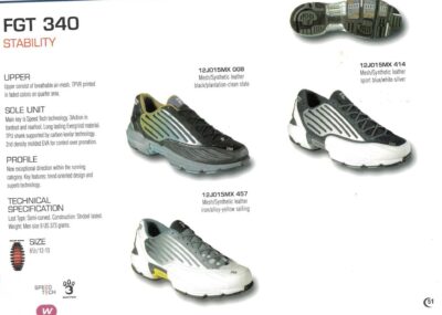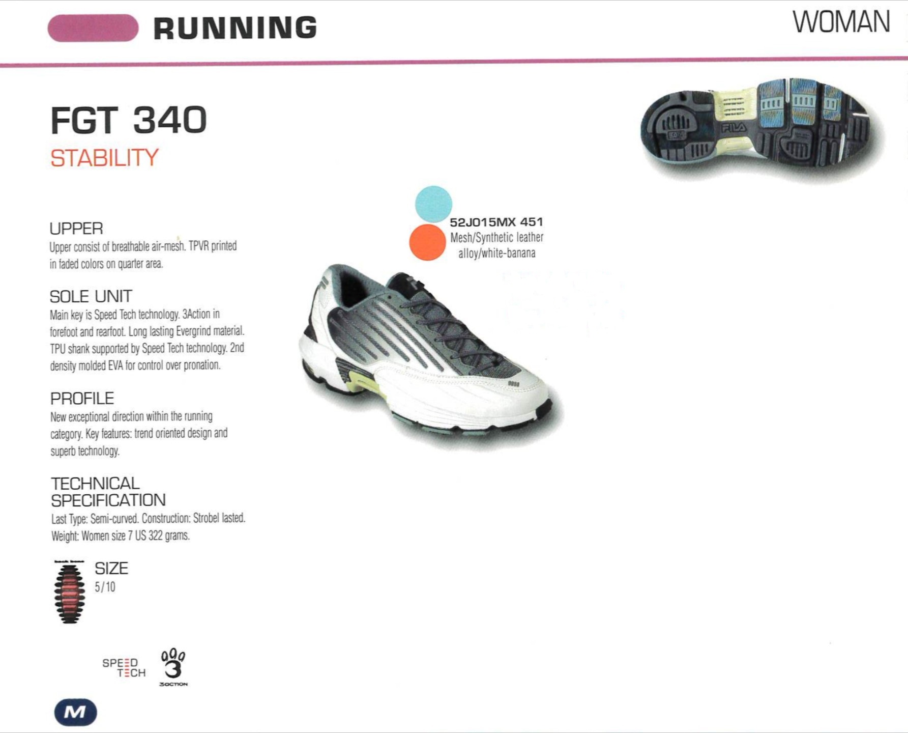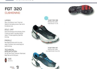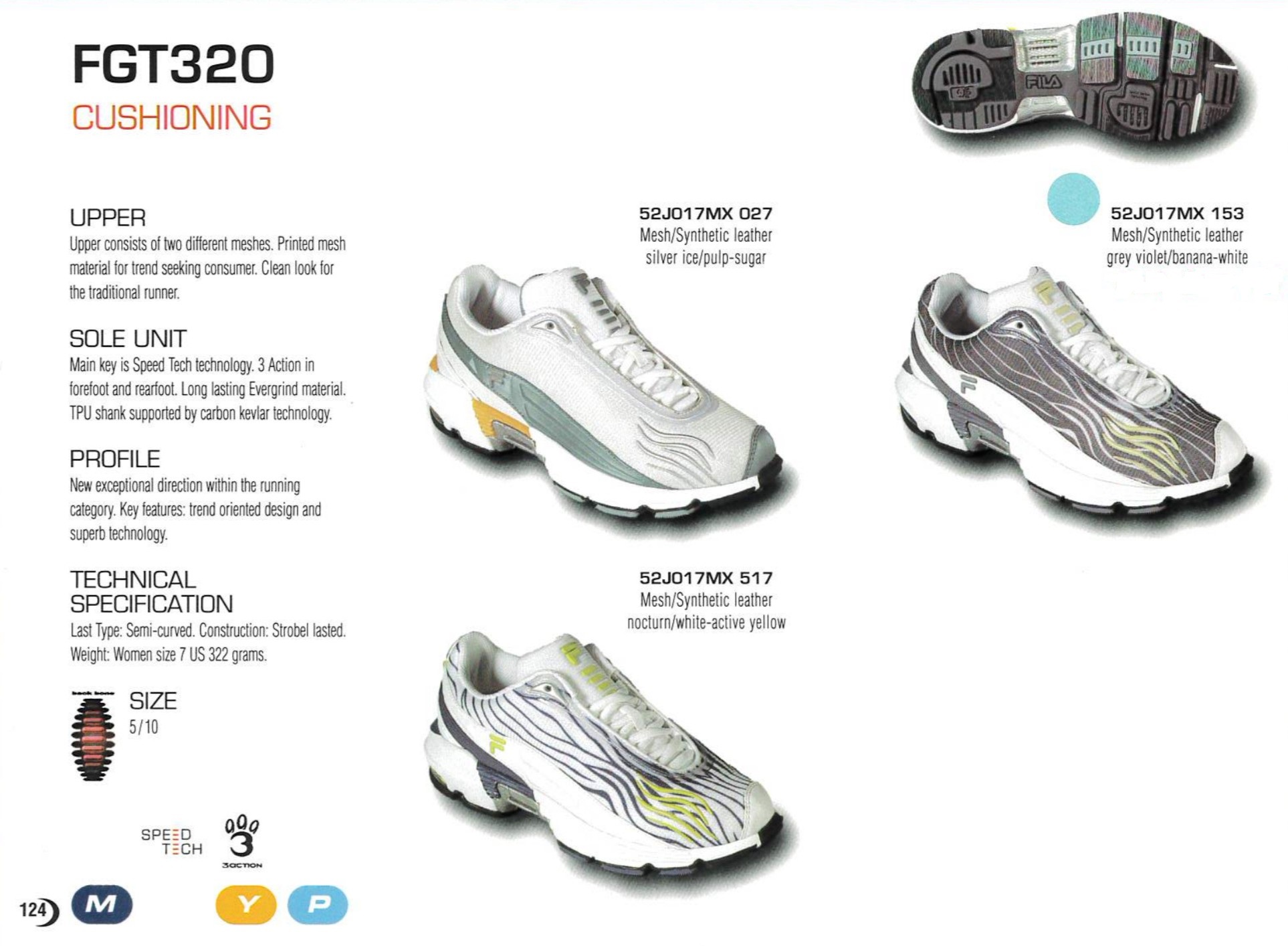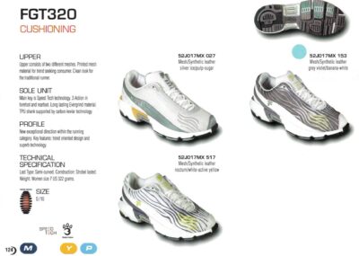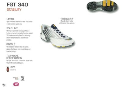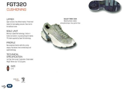Giving runners more options were the FGT 320 and FGT 340 models for 2002, Favaro giving them their unique designs. Given the timing of release, they likely featured the same full-length plate featured in the Racer K1 that debuted the same year. The FGT 320 was designed for neutral runners while the FGT 340 was for those requiring more pronation support. Like the F1 High Speed, which was still available alongside the newer models, they used 3A cushioning. Both weighed slightly less than the F1 High Speed, 350 and 360 grams respectively.