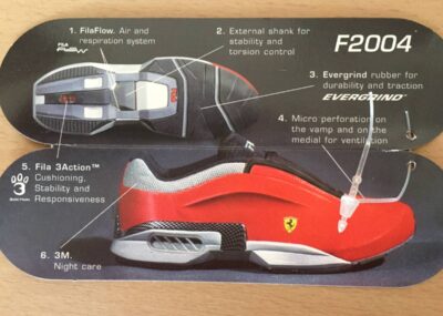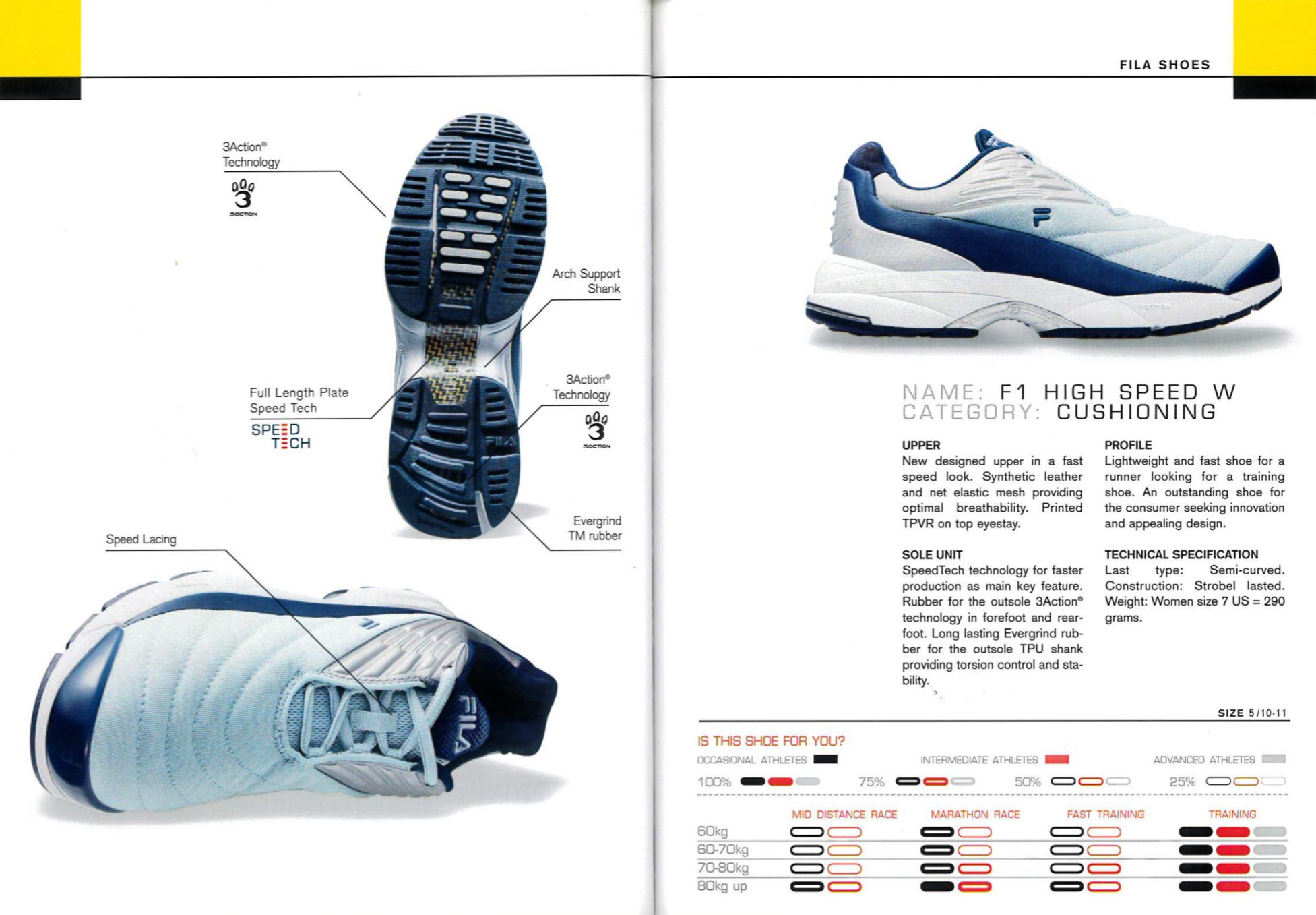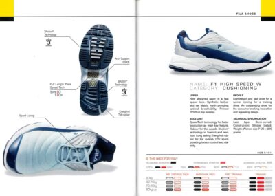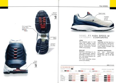 It was called the F1 High Speed, Fila putting the Carbon-Kevlar plate into the existing F1 model that released in 2000. Both models featured distinctive motorsport styling thanks to the talents of Stefano Favaro, who joined Fila in 1998. Runner’s World were positive in their review, saying the Carbon-Kevlar plate gave the ride smoothness and added propulsion. Cushioning was also praised, with the F1 High Speed featuring 3A cushioning, an update of the 2A cushioning system, using elastomer to improve on overall performance.