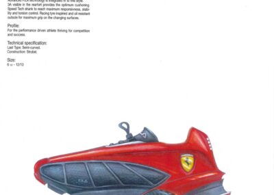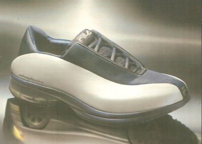 The carbon-fibre plate at the centre of the concept was flat and specially shaped to taper towards the rearfoot, mounted below the midsole foam and just above the outsole. This was broadly similar to what Fila would eventually do with their Carbon-Kevlar plate-equipped series of running shoes that first commercially launched in 1997 with the Silva Racer after appearing in prototype form in various races during 1996.