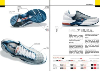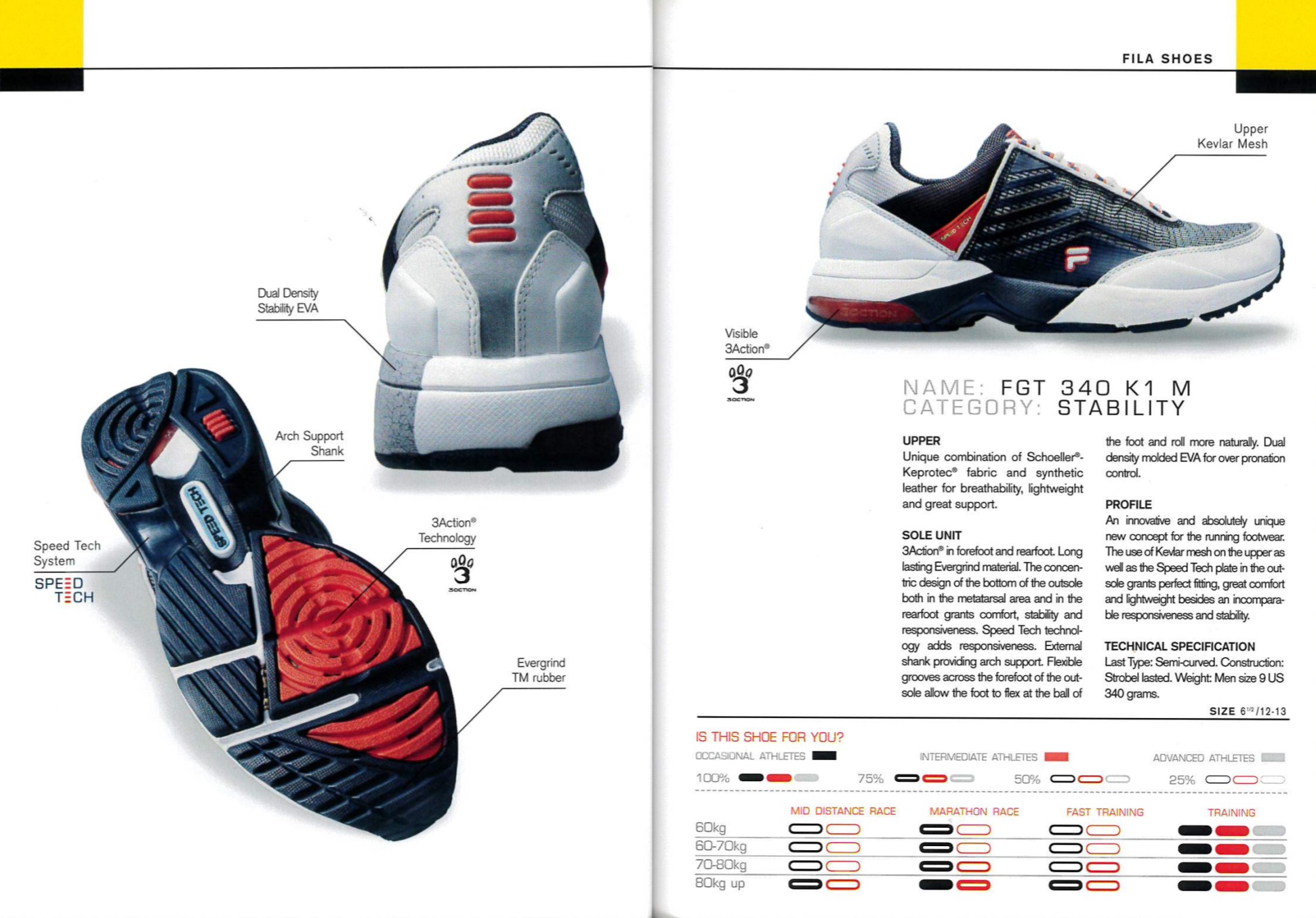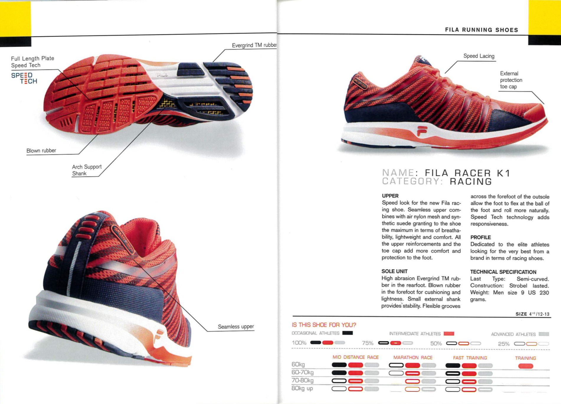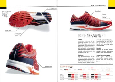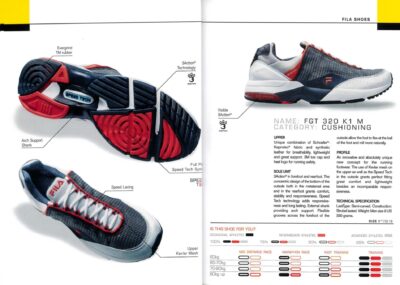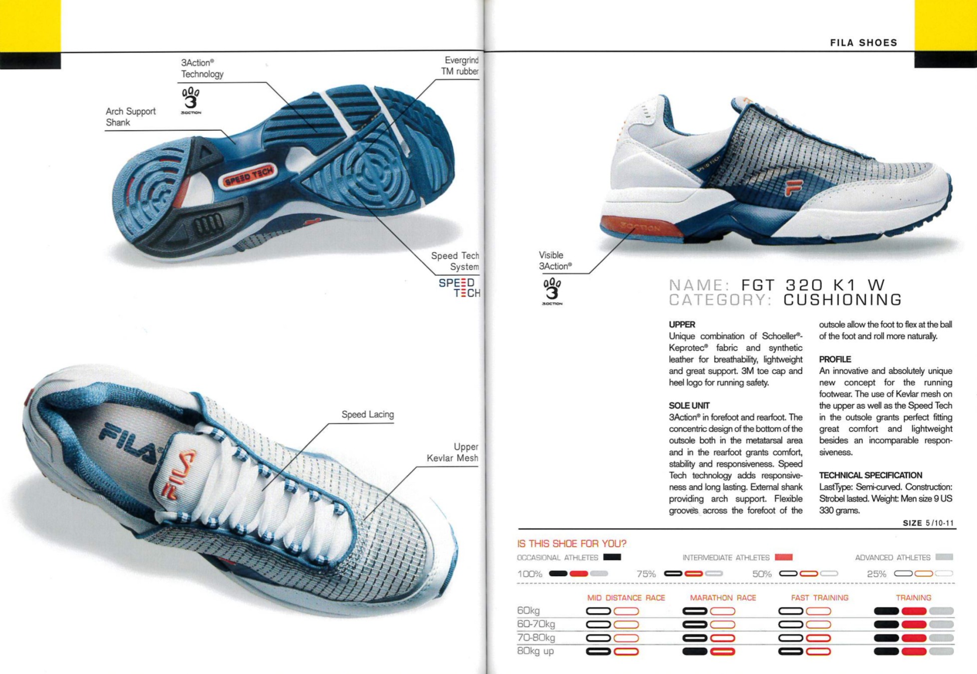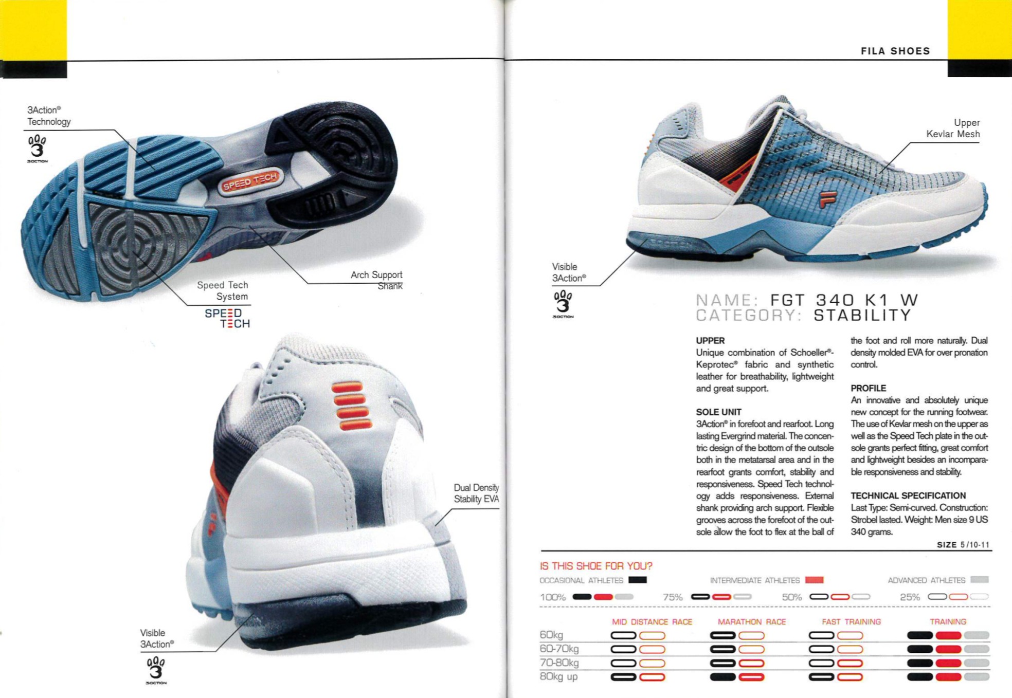 Both the FGT 320 and FGT 340 reviewed well, Runner’s World more effusive in their praise about the propulsion given by the plate, particularly when running at faster speeds. Building on this positivity, in 2003 Fila would release updated versions of both models with the K1 moniker added on as well as softer foam to reduce the harshness of the plate. Weight would also drop, the pair now down to 330 and 340 grams each.