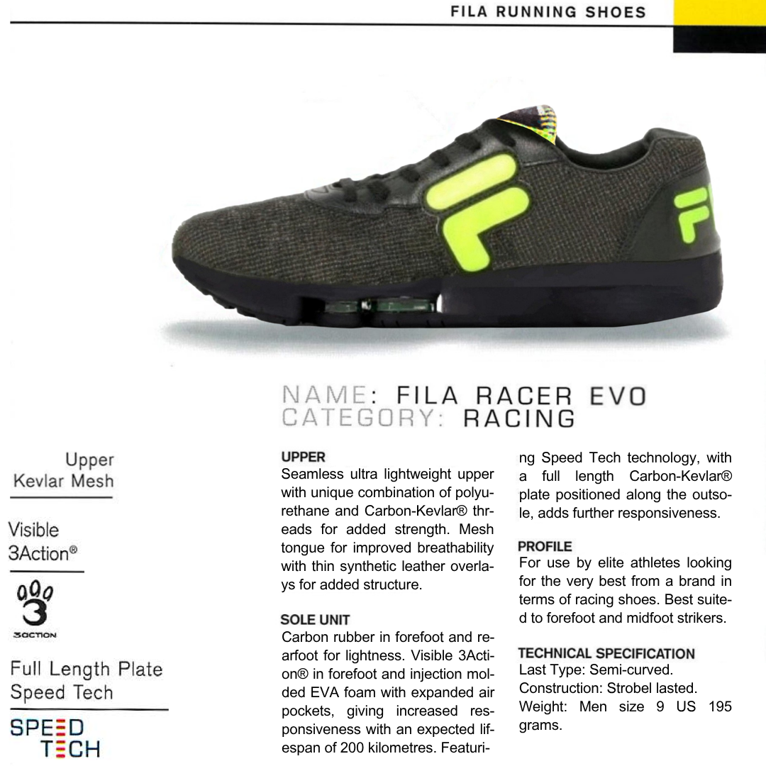 During the late nineties until the early noughties, Fila were one of the dominant forces in elite distance running. You can read more about this time in my article on Marathon Handbook, but in short they produced the first racing flat with carbon-fibre plates (Carbon-Kevlar to be specific): from the Silva Racer, Racer, Racer Plus, Racer K1, and the Racer K4, Fila captured countless victories in international distance running.